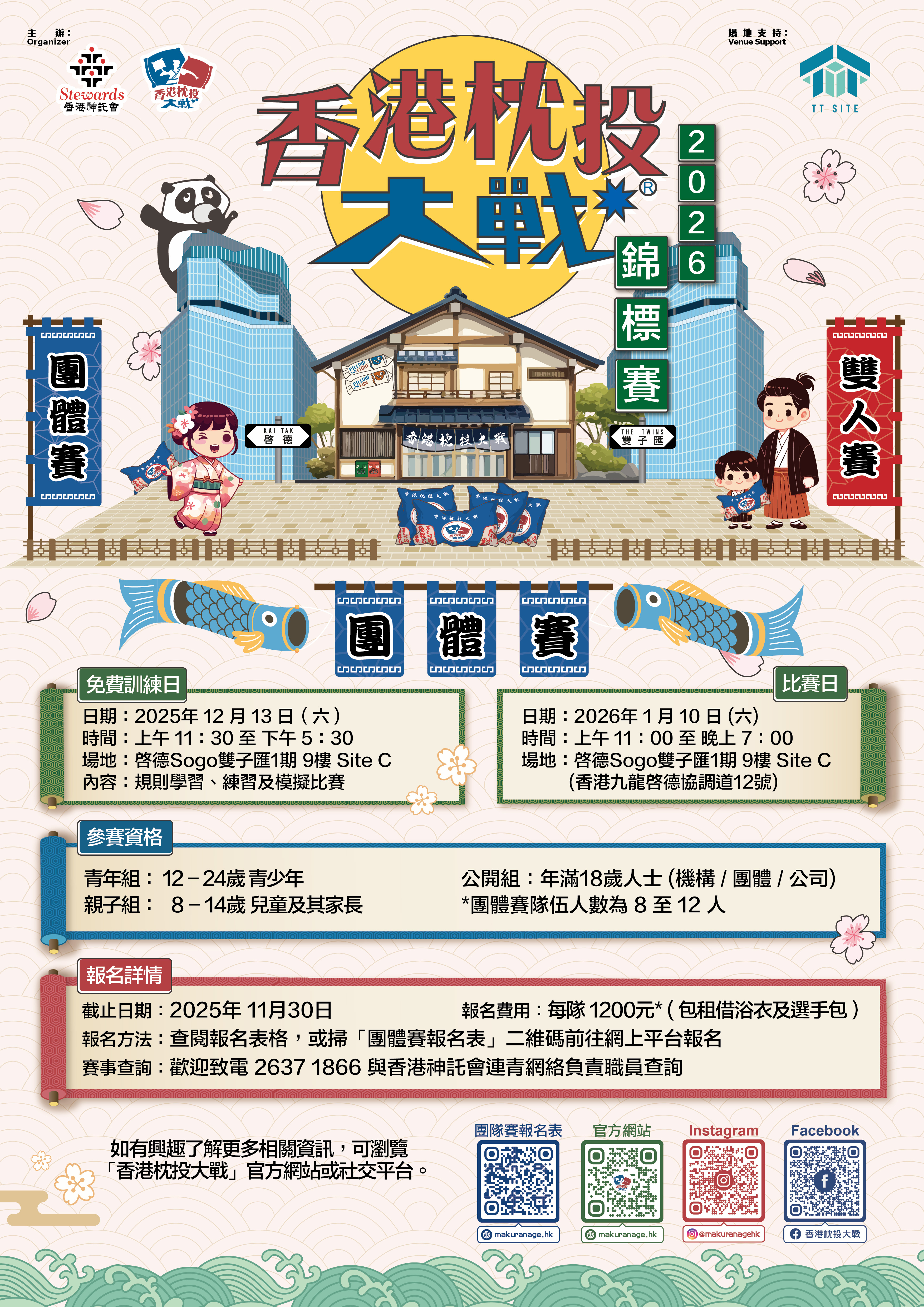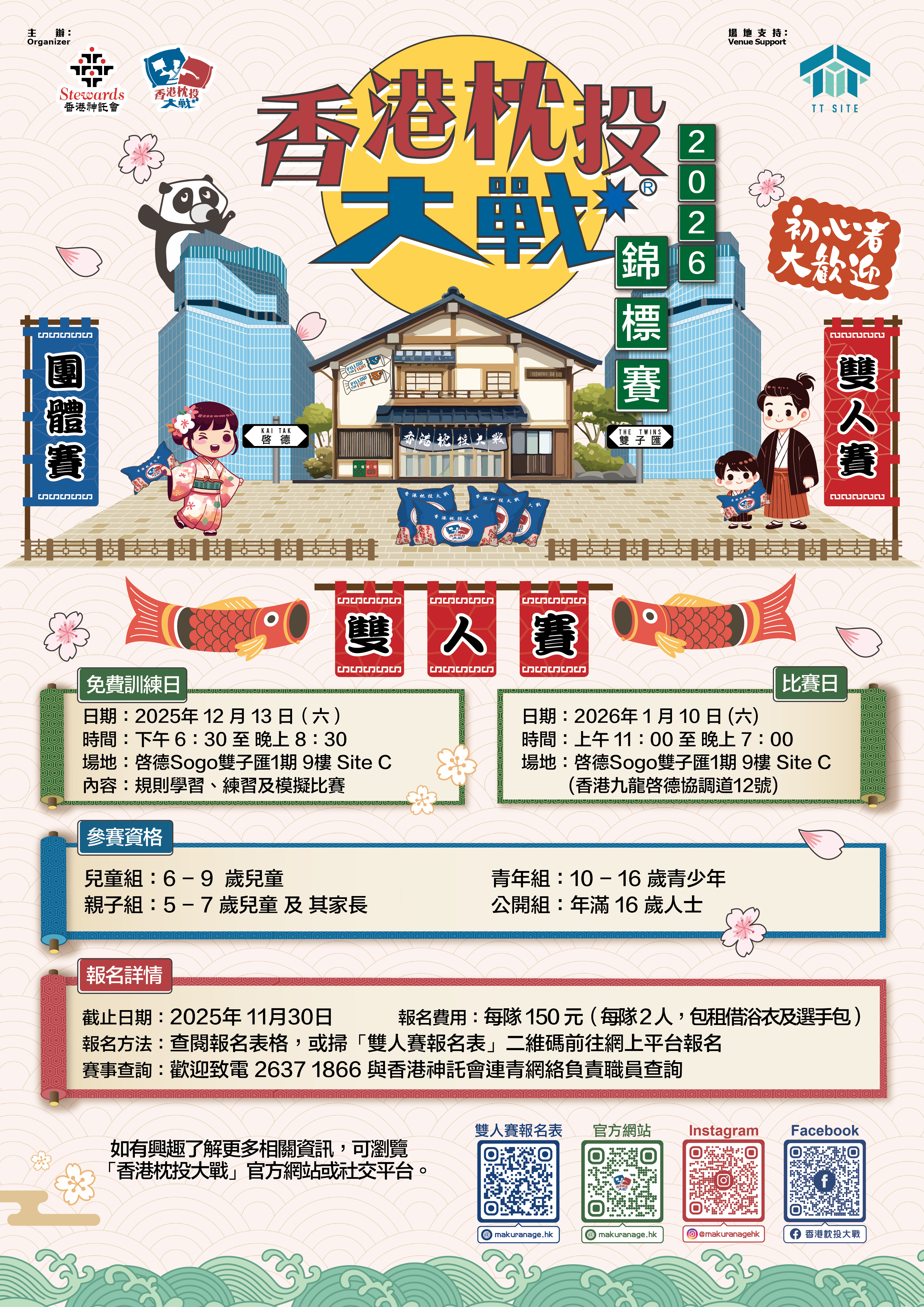香港神託會(下稱本會)於2019 年正式引入「枕頭大戰」,與「全日本枕頭大 戰大會」成為合作夥伴,並獲授權成為香港獨家代理。本會將此項活動正式命名為「香港枕投大戰®」及已取得商標註冊。